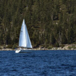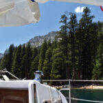 The final day of our charter dawned sunny and a chilly 49 degrees F. In July? Before anyone could object to the temperature, though, I set the mainsail, hauled up the anchor and had us ghosting along with the slightest wisp of wind, not enough to stir the flags onshore. A few hours later we approached Tahoe Keys under power, regretting the fact of our having had to end our time onboard this way.