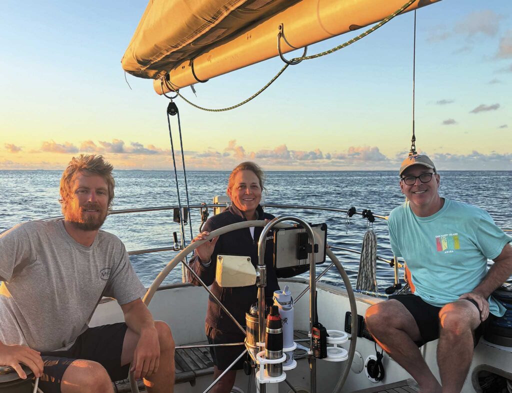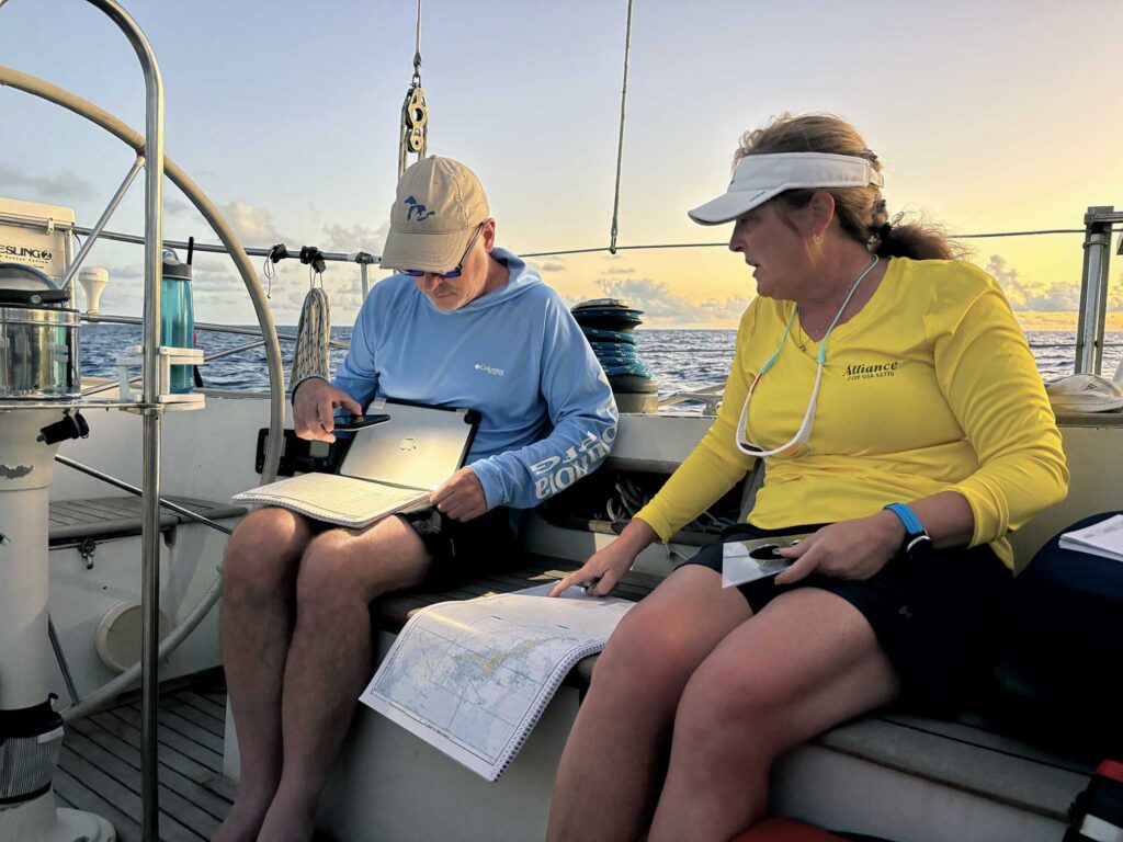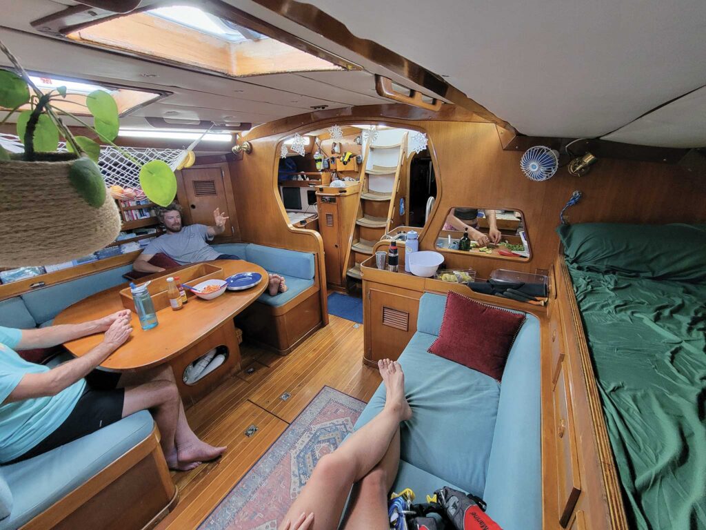 Arbella is owned by Tucker Mitchell and Catherine Nurse, an engaged couple who’ve called the boat home since they moved aboard in July 2024. Their charter business, Salty Coffee Sailing Expeditions, doesn’t provide luxury passages with gourmet catered meals, flowing cocktails and turn down service. Instead, Tucker and Catherine offer guests immersive training in offshore sailing and cruising. Charter guests are instructed as working crew, standing watches, navigating, hoisting sails, washing dishes, logging data, and learning CIQP procedures (customs, immigration, quarantine, port authorities) when arriving to and leaving from foreign countries.