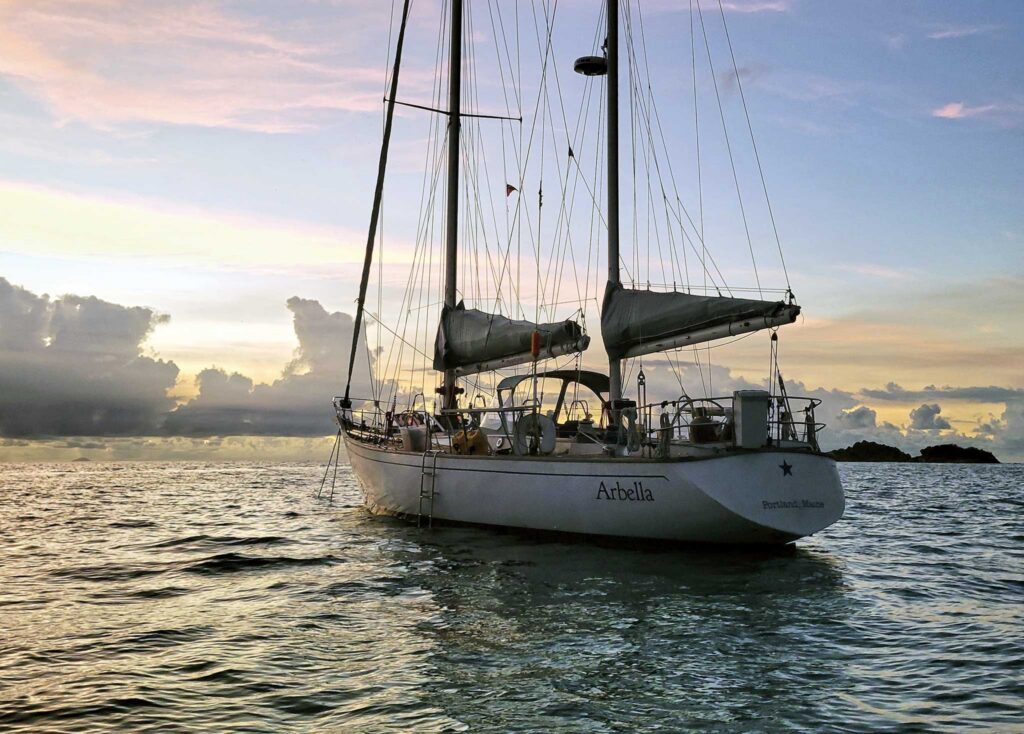 Tucker replaced Arbella’s mast step, standing rigging, transmission, seacocks, and battery bank. He rebuilt the steering system, rebedded hatches and deck hardware, bought a new main and mizzen, and completed countless smaller projects. Catherine and Tucker moved aboard in July and started Salty Coffee Sailing Expeditions that winter. Their dream had become a reality.