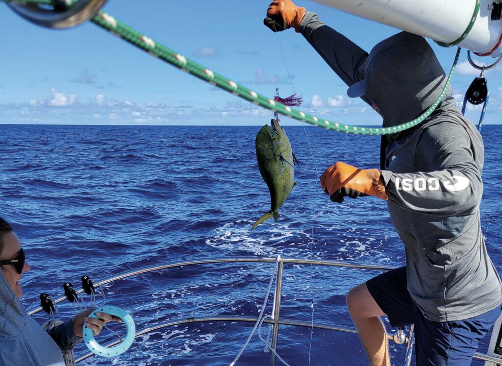 During our afternoon watch, Tucker trailed a fluorescent fishing lure behind the stern. We forgot about it as it skipped and dove in the boat’s wake. Hours later we heard, “Fish on!” He’d hooked a technicolor Mahi Mahi! We devoured a freshly sautéed filet in the cockpit with a squeeze of lime.