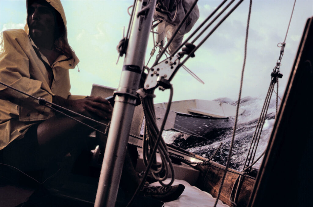 After dropping Recycle’s hank-on jib, I started the motor and, timing the breakers as best I could, turned her around into the big seas. Warm seawater washed over the foredeck as Recycle rolled to port and starboard. Although I was able to locate my now nearly submerged dinghy, there was no way to retrieve her in those conditions. The best I could do was stand by and hope things would calm down as we drifted with the current.