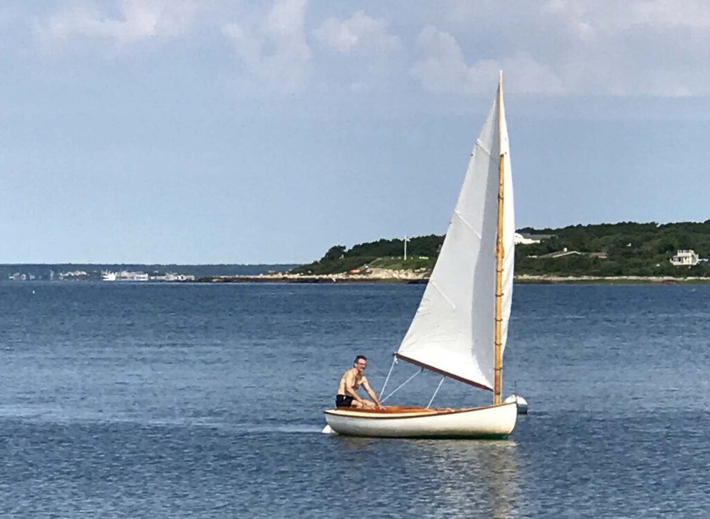 I tied in a reef, reducing the sail area so our 12-foot Barnstable catboat Finn wouldn’t have too heavy a weather helm in the gusts. I stood in the cockpit, readying myself to jump onto the foredeck to release the mooring line, eyeballing the surroundings once more. The weather conditions were spectacular—temperature in the mid-70s, sky duck-egg blue, wampum-colored clumps of cloud progressing along the northern horizon, air clean and dry, visibility vivid and unlimited. The only hitch was that the wind was gusting to 15 knots out of the northwest—an unusual direction for Buzzards Bay in August.