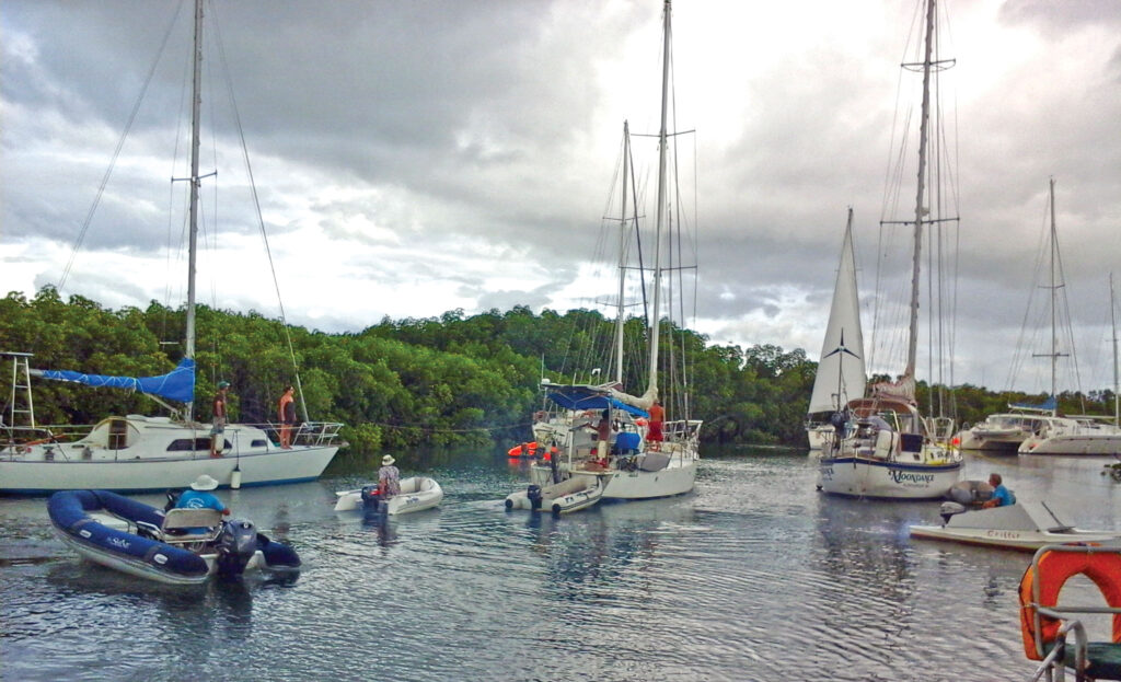 After the monohulls, the catamarans motored in to take their positions in the shallower water. Eventually more than 30 sail and motor boats of all shapes and sizes had entered the river. Anchors were dropped forward and aft. Lines were tied onto the mangroves immediately alongside. These would be moved, tightened, loosened and tightened again dozens of times over the next 48 hours. Everyone pitched in, following the lead of the old hands and the local Fijians to ensure everyone was securely tied up.