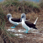 After a climb to the top of the steep hill to the west of the anchorage, we also found a colony of boobies: strikingly attractive birds related to gannets and superb divers. Both blue-footed and green-footed varieties share the colony, nesting on the ground as the males and females take turns sitting on the egg while their partner fishes. The blue-footed boobies also perform a strange courtship dance together, lifting first one foot then another off the ground and raising their tails. Both species are completely unafraid of humans, and we watched them for hours.
