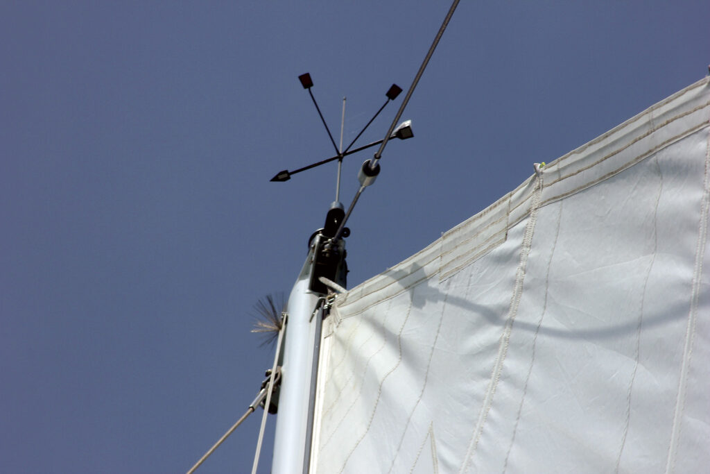 A masthead wind indicator is now standard equipment on most yachts. A quality example is remarkably stable, and apart from a natural-born adventurer of my acquaintance who bent his during some unpleasantness in a famous English Channel tide rip, I have never known one to fail. Did you realize you can adjust the angle of the arms? Some have neat screw arrangements. Even at the bargain basement end of the spectrum you can always bend them so that the arrow sits over the tabs when close-hauled. For a modern cruiser, a total angle of 65° is about right, which will coincide with an apparent wind reading from the masthead transducer of 32½°. For those of us who operate in open water, 70° or a bit more is probably more realistic once the waves kick in.