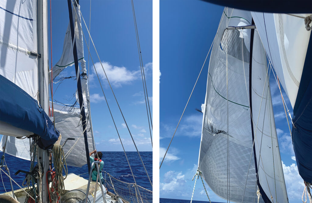 By the end of that day the delamination had worsened, and table-sized areas of taffeta were now flapping in the breeze. Stupidly, I didn’t bring the sail down, rationalizing the situation by saying, “What’s the worst that could happen?” After all, we were still sailing at 7 knots, and it was almost dark; best we wait till the morning. While I had done a lot of reading over the two years leading up to the crossing, getting my hands on as much information from magazines, websites, blogs and cruisers as to what could go wrong offshore, I had never heard of such a failure occurring. Perhaps this is why I didn’t immediately drop the sail, a rookie mistake that almost cost us the crossing.