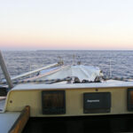 Satisfied that Folly’s systems were working well, we left Sandy Hook astern as darkness fell and headed out onto the open ocean. We had prepared as thoroughly as possible for this risky trip south, replacing the broken stanchions and guardrails to make sure we stayed on board, and ensuring the liferaft and grab bag were ready to deploy. We had also made the usual preparations for an overnight passage—navigation lights and torches working, lifejackets ready to grab, harnesses on and a meal prepared. We couldn’t expect tow-boats or other rescue craft to be easily launched, if they were operating at all. We wondered how Folly was going to behave without the mast and rigging to stabilize her.