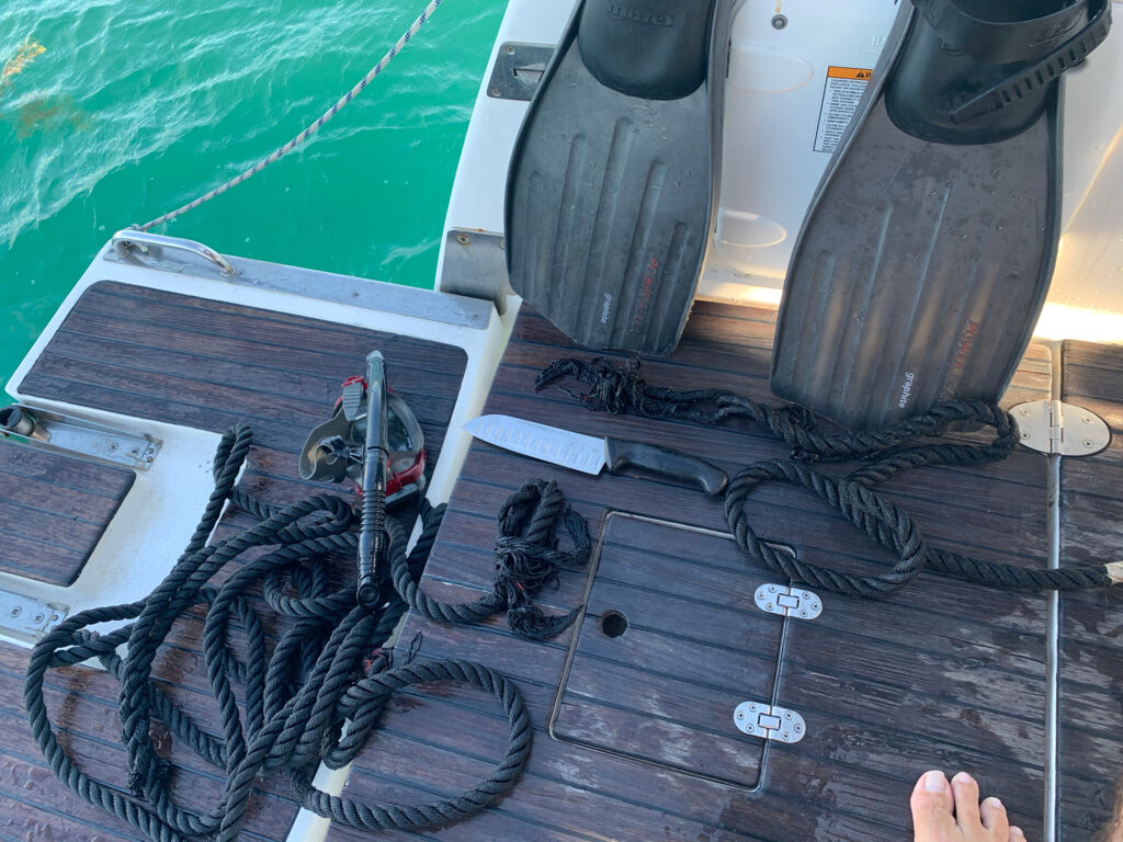 By dawn I estimated I’d dragged about 300 yards. Luckily the depth had remained a near constant 26ft. Going over the side again, my initial dive revealed a number of tight, clockwise wraps around the propeller shaft. This made sense, given the direction of the gear rotation the day before. I was able to undo a first wrap without much of a fight before having to come up for air.
