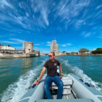 John gives the new dinghy a test drive in La Rochelle before departure.