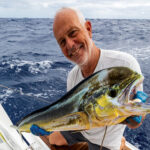 As alluded to, Lydia turned out to be a dynamo in the galley and regularly fed the crew fresh baked bread and pizza. We also caught plenty of fish. At one point while soaping up on the transom for my daily seawater bath, I looked aft and caught sight of a large mahi-mahi, leaping through the air in a flash of gold and blue. Flying right across our wake he then attacked our lure from above. We eventually succeeded in landing him, and he became dinner, then lunch and dinner again.