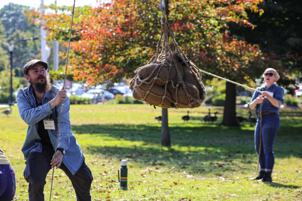 Down by the docks where Piscataqua (a “gundalow” or historic shallow drafted sailing barge) is berthed, presenters gave a lesson to a small crowd of onlookers, complete with hauling shanties and a weight raised and lowered to simulate the work that would have been done to the rhythm of these songs.