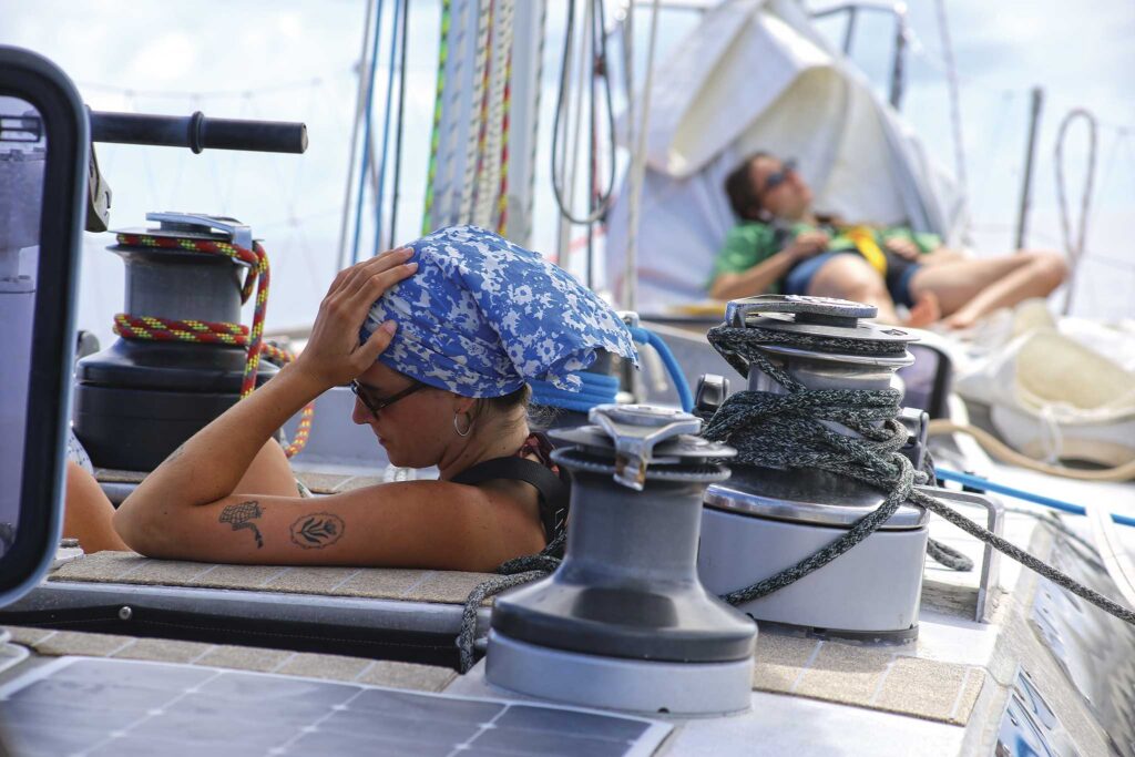 I washed my hair, and the seawater on my scalp is a baptism. Ade is fast asleep near me on the side deck, and I’m finally lounging in the forward working cockpit, which I’ve been dreaming of since the first night I saw the boat back in Lanzarote. Forward of the dodger, there are two deep wells on either side of a grinding pedestal, perfect for curling up in. I have shade and a cool breeze, and all is well