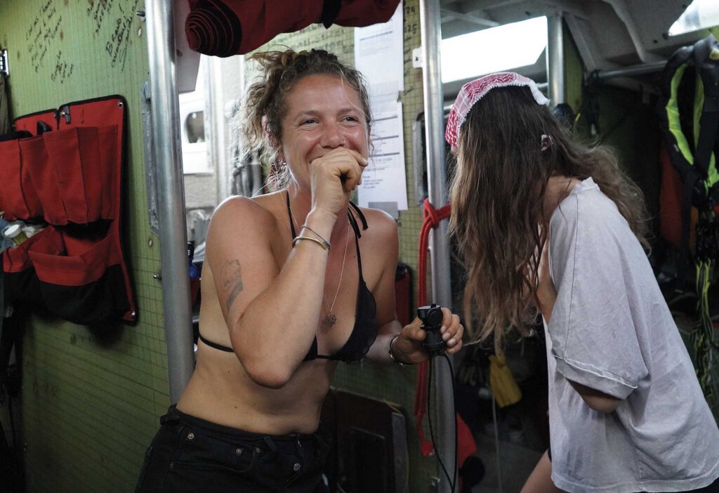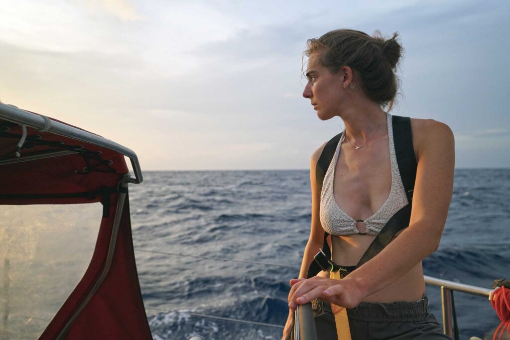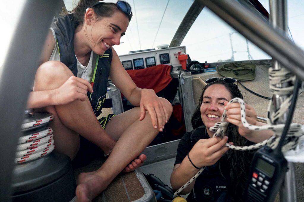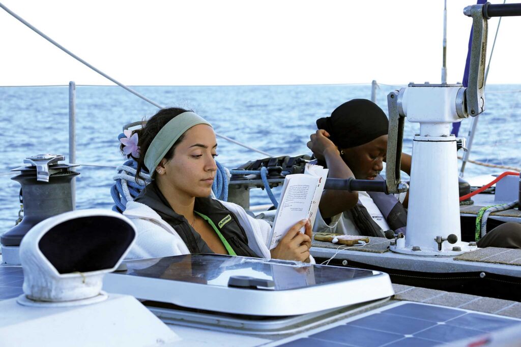 It didn’t take long to assemble a team of five other activists to help put the project together: Lucie Morauw, Camille Étienne, Coline Balfroid, Miriam Toure, and Maïté Meeus. They each represented a different campaign, spanning from human rights to PFAs, but their sailing experience was minimal. Maïté, a women’s rights activist, was brought on with the simple question, “Do you want to go to the COP with us?” By the time she realized the plan was to sail there, it seemed too late to back out. When she saw a utilitarian marine head for the first time…well, in for a penny, in for a pound.