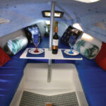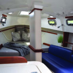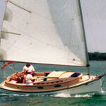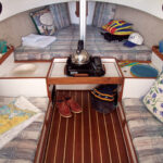 Another popular catboat with a long pedigree is built by Com-Pac Yachts (com-pacyachts.com) in Clearwater, Florida, another company with a long history—Rich and Gerry Hutchins started it in 1974. The 20-foot Horizon Cat was designed as a weekender for a couple, and with two large berths, plenty of stowage, and a screened-off head it serves this purpose admirably. Wheel steering, a diesel inboard and Com-Pac’s patented Mastender system, which allowed the rig to easily be deployed or stowed by one person, all serve to make this a popular small cruiser. Like the other Com-Pacs, it has a long lead-ballasted stub keel that houses the centerboard, so there is no centerboard case to intrude into the accommodation.
