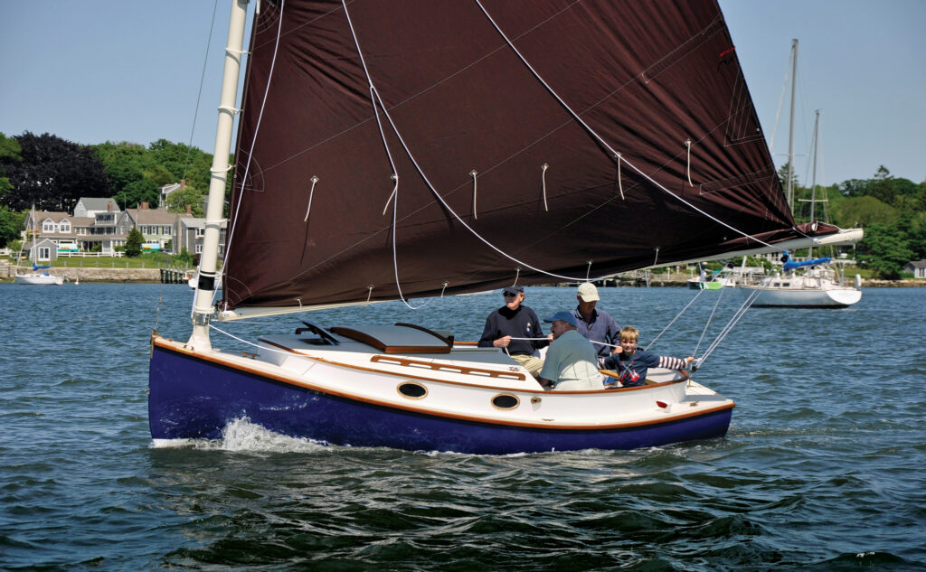 Are you never happier than when hugging the coast, exploring shallow waterways, and anchoring in lonely gunkholes? You could be tailor-made for a New England catboat, with its capacious accommodations and easily handled single sail gaff rig. Actually, of the three boats, we looked at only the Marshall Sanderling is built in New England. There are more than 800 of these pretty little boats on the water, and their genesis goes right back to the early days of fiberglass series boatbuilding—the first Sanderling was launched in 1962. Four can sleep comfortably in the roomy cabin, and the cockpit is big enough to hold six people. A self-bailing cockpit makes the Sanderling capable of open-water sailing, and those who want to sail—as opposed to trail—long distances can have a small diesel installed in lieu of the standard outboard.