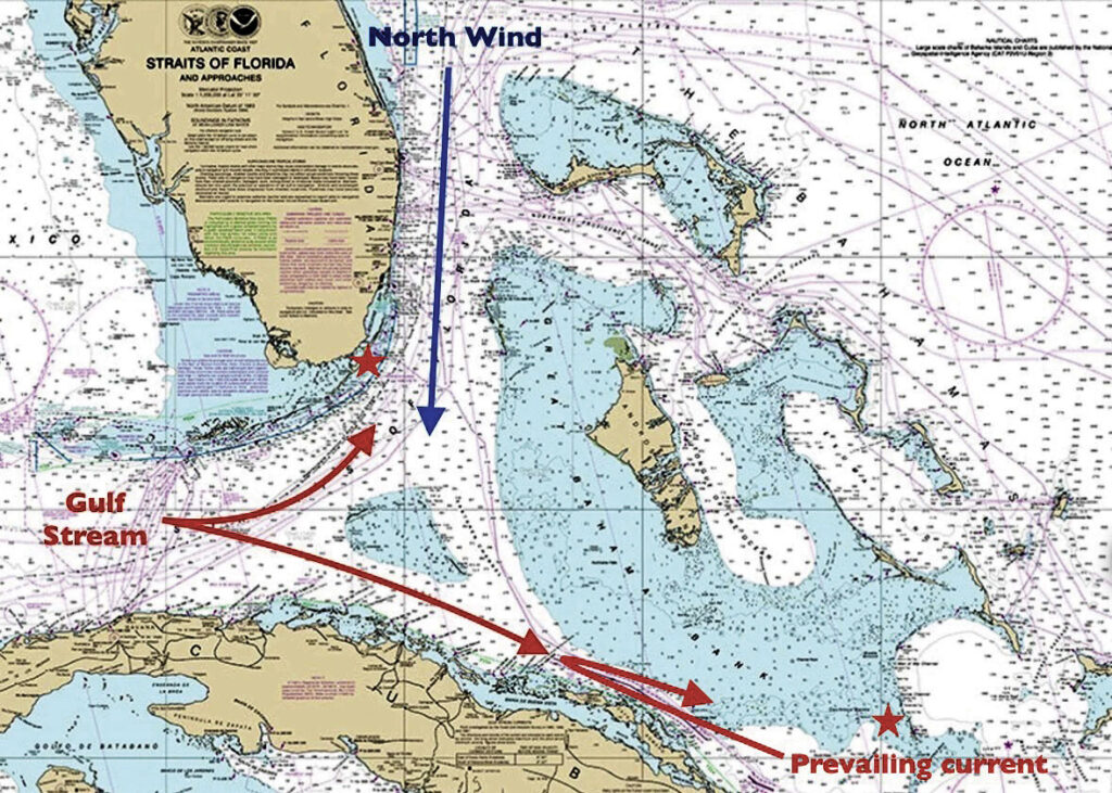 I’ve found myself surprised by currents many times. In one such instance, we were sailing from the Ragged Islands in the Bahamas to Key Largo via the Old Bahama Channel along the north coast of Cuba. The models on my weather apps all agreed that sailing should be good along our route. (I hadn’t consulted a human pro for this one, and perhaps I should have.) A cold front accompanied by a strong north wind had just crossed over Florida and the Bahamas. Our plan was to ride the tail end of this north wind down towards Cuba; by the time we turned west into the Old Bahama Channel, the wind was scheduled to clock around to the southeast and send us sailing blissfully downwind towards Florida. That same southeast wind would have plenty of time to settle down the Gulf Stream before we reached those waters.