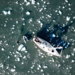 Check out the shot above taken from the drone—you can see Isbjörn in the ice, James, in black, swimming behind her with his camera, Brian and Blue filming in the dinghy, Mia at the helm, me by the dodger in the yellow hat piloting the drone, and Brady and Kiril manning the “ice defender” poles to push the biggest pieces out of the way. It’s one of my favorite photos from the project and perfectly illustrates how much was going on at any one given time.