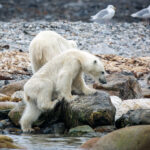 After that, the bears ambled along the shoreline looking for their next meal. They found it not much later in the form of an old whale carcass that was mostly skeleton. Next to it, though, was a large patch of blubber that must have survived the winter under the snowpack. Mama bear found it, directed her cub toward it, and together they feasted while we watched. To say it was an emotional experience would be an understatement. Just look at the photos. To be that close to nature, to the symbol of the Arctic itself…there are no words.
