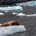 After landing the dinghy on the old moraine between the boat and the glacier, we climbed the next hill, some 150ft high, and were greeted by an amphitheater-like view of the glacier face and the small bay just in front of it. A couple of fur seals were hauled out on glacial ice that had calved into the bay.