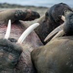 In fact, we’d sailed right into an enormous pod of them, the iconic white whales of the north. The Delos crew scrambled on deck with its camera gear. There were literally dozens of whales, all swimming into the fjord in unison, spouts covering the horizon, the distinctive white, dorsal-fin-less backs arching out of the water. James had brought along a hydrophone, and from the dinghy, Brady, Kiril and I recorded several minutes of the belugas talking to each other with their echo-locating, a chorus of beautiful, otherworldly sounds. As we passed the headphones around, our faces lit up in surprise and delight at the whale’s songs.
