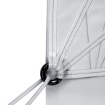 Using small rings with nice, thin lazy jack lines means less sail chafe than would result from using smaller, more expensive blocks. By running the lines through rings, the system will also be lighter and the airflow over the surface of the sail less disturbed.