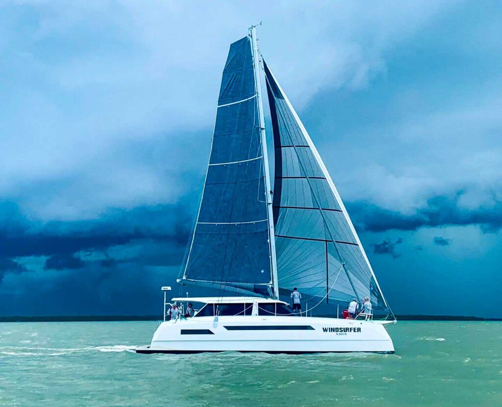 Once they decided they wanted to build their own boat, they again trusted the process to get them to the right one. It was not a straight line, but ultimately they settled on a Max Cruise 44, designed and built in Vietnam. With two carbon daggerboards, relatively narrow hulls, and sharp reverse bows, the performance cat has a displacement of just 20,000 pounds.