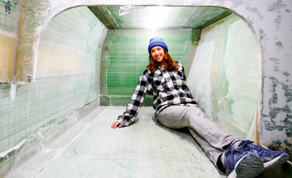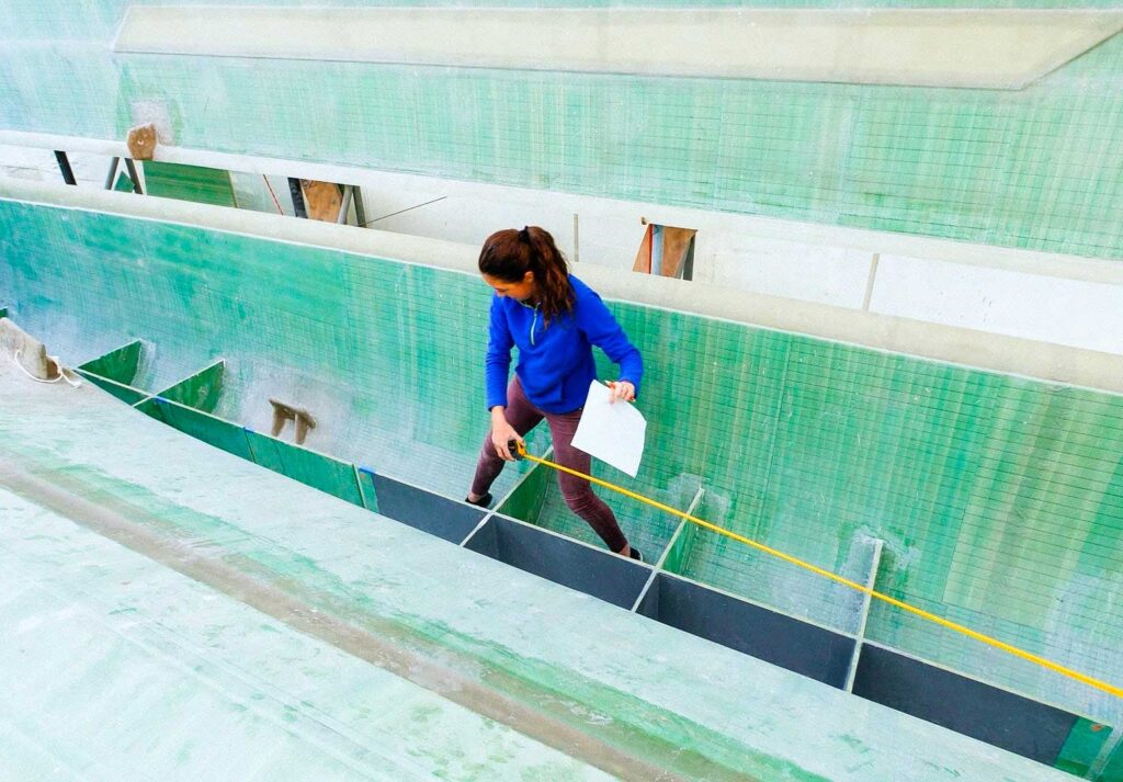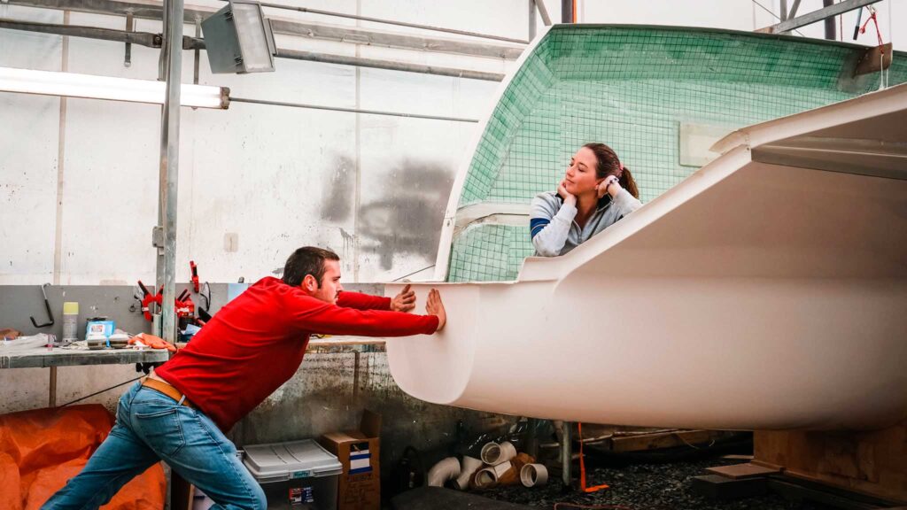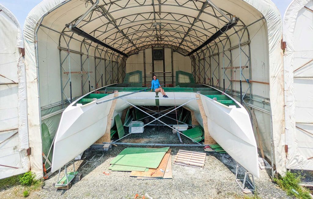 The build began in March of 2021 when containers arrived with the hulls and other major pieces. Even then, the pandemic’s effects were slowing them down. Shipping costs were soaring and shipping routes were compromised. Getting materials like fiberglass and vinylester resin—which is what the boat is built with—bogged down for a time. All the while, Matt and Jessica dove in with their usual energy and sunny determination, learning, making mistakes, learning some more. Often, the builder was learning with them, since this was the first “kit” version of this hull.