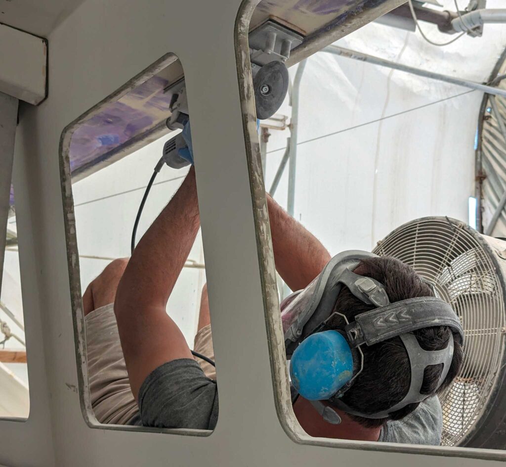 They are not shy about explaining their mistakes. For instance, he says, the company recommended that they dry-fit all of the parts first, but because of how and where they were building the boat, that was logistically not possible. So, when they glued in the cockpit seats, after measuring multiple times, they ended up 5 millimeters wider in the forward part of the cockpit, where the seats meet the door, than aft. As with navigating, a small mistake at the beginning multiplies out the farther you go. In the unforgiving realm of boatbuilding, what it all meant was many additional hours and weeks to correct—grinding, filling, fairing, re-gelcoating.