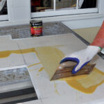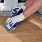 When the glue is nearly ready to bond, instead of trying to locate the large wobbly sheet of veneer accurately on top of the plywood, it is much easier to lower the plywood on top of the teak, matching it with the guidelines you drew there earlier. The teak can then be trimmed to size, separated from the rest of the original sheet, turned over and smoothed using a wide blade plasterer’s trowel. A trowel works better than a roller, because most rollers are attached only at one end and the pressure you apply is bound to be a little uneven. A wide blade trowel with the handle in the middle allows even pressure to be applied over the entire length of blade as it is drawn along the veneer from the center outward. This squeezes out any air bubbles, minimizing the chance of future bubbling of the veneer.