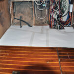 It would have been difficult to shape such a cumbersome piece of plywood on the boat, so I made a template using some sheets of art board and with its help trimmed the plywood with my table and jig saws back in my garage. When I hauled the floor back to the boat for a trial fit, it dropped in place perfectly. With my new floor now cut to size I painted all the edges and underside of the plywood with two coats of Interlux Primekote two-part epoxy primer to keep out moisture.