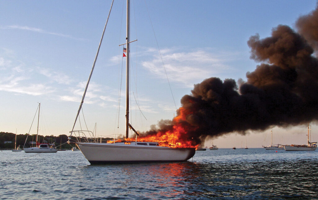 These represent over half the fires that break out aboard sailboats and are usually caused by fuel or electrical problems, or both. Cut the engine and turn off the batteries. Turn off the fuel supply. If you haven’t installed a Fire-Port, carefully open the engine cover just enough to insert a fire extinguisher and trigger it. Repeat as necessary, but beware of opening the engine cover too soon or a fire may flare up again. Dry chemical extinguishers aren’t the best at fighting engine fires—it’s difficult to direct them at the source of the flames—which is why the ABYC recommends that gaseous extinguishers, like those employing Halotron I, which either displace the oxygen feeding the fire or interrupt the combustion process, be used.