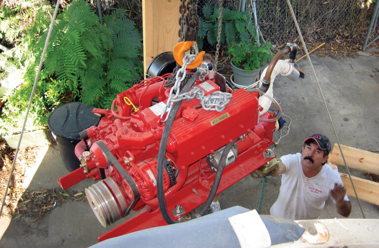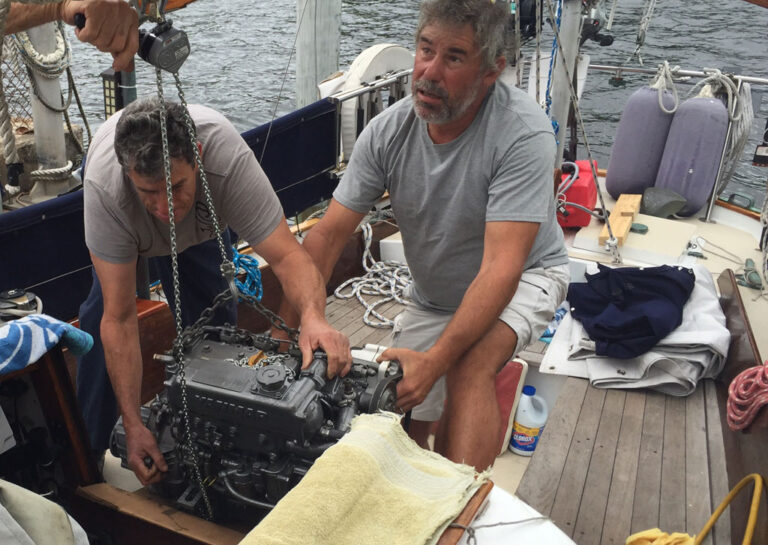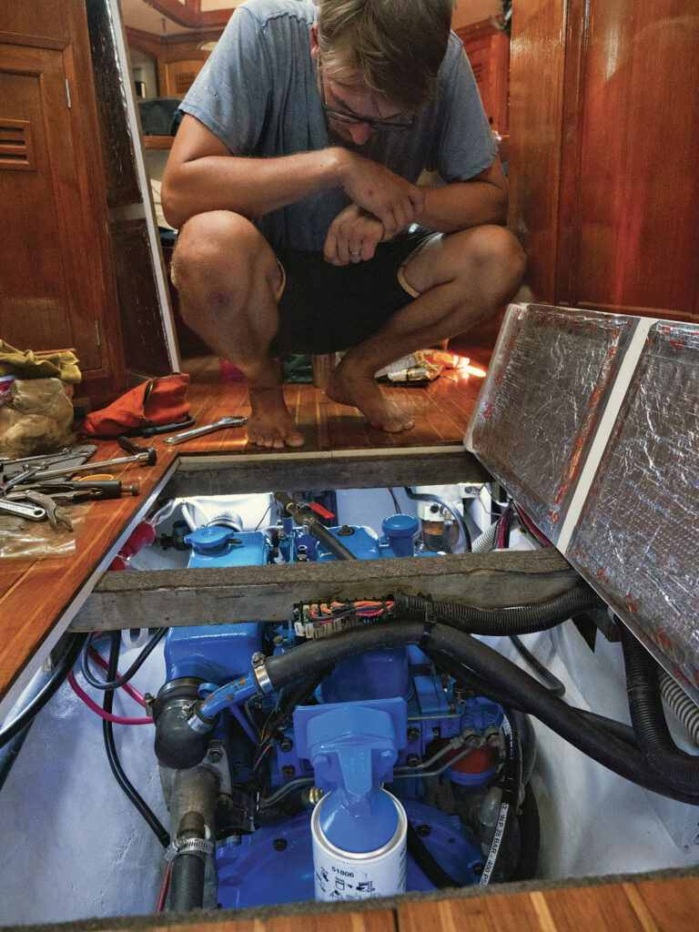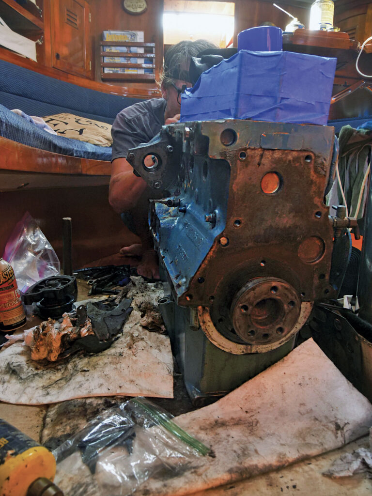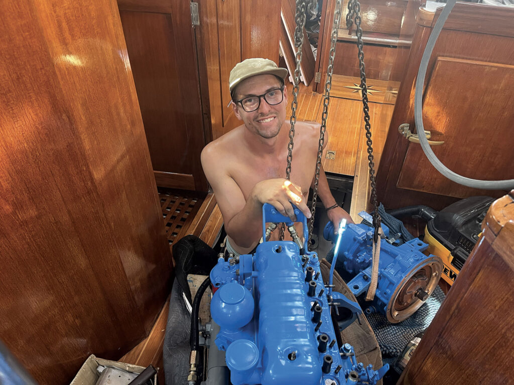 The first day was all about logistics: how to get a 600-pound engine out of our cramped cabin space. Chris hopped in the dinghy, and when he returned he had a 12-foot, 6-x-6 timber precariously balanced across our 8-foot Fatty Knees tender. With the timber run across the top of the salon and through the portlights, and a chain hoist loaned to us by Richard from S/V Sourdough—a fellow Perkins owner—we were ready to lift the engine.