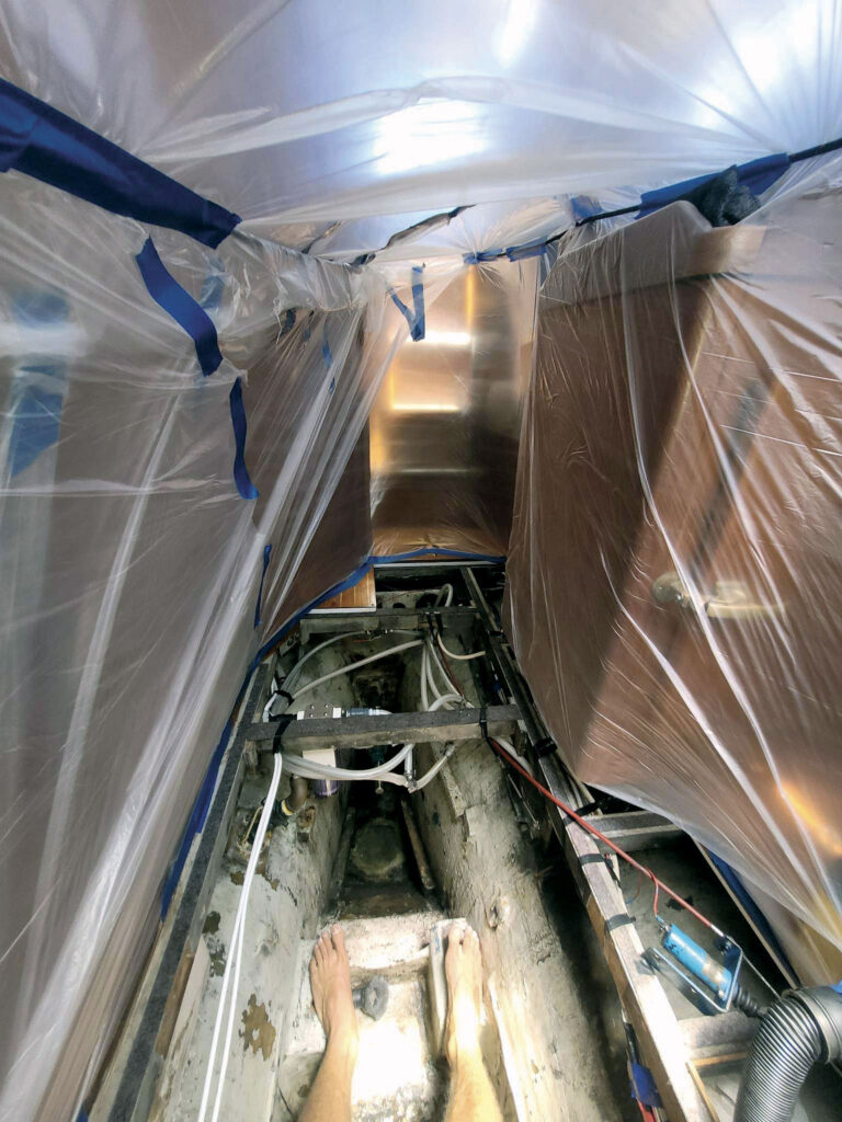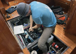 Since we thought our five-year refit was behind us, we didn’t pack any Tyvek suits when we set off cruising in 2022—a lesson quickly learned when we realized they were impossible to find in Banderas Bay. Chris, ever determined, ground our fiberglass bilge and engine compartment without one, after creating a plastic tent to corral the insidious fiberglass dust.