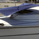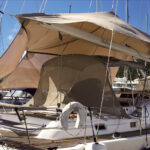 If there’s one instinct common to humans and animals it’s the need to seek shelter from the heat of the sun. Biminis are ubiquitous in southern waters and are increasingly seen on boats in the north. Over the years these have morphed from modest sunshades that screen the helmsman and can easily be folded out of the way to extravagant affairs that cover the entire cockpit and are, in effect, permanent structures. More commonly, existing dodgers can be modified with infills that zip between the dodger and bimini to protect the crew. Of course, these restrict the view of the sails so are best left unrigged while underway.