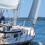 No one wants a boat that won’t go to weather, even if you don’t intend to do so very often. This is why you see so many boats with headsail sheet tracks set as far inboard as possible, even on the cabintop. The angle between the boat’s centerline and a line drawn from the sail’s tack to its clew when sheeted in hard is the sheeting angle. This can be as tight as 7 degrees or less with a non-overlapping jib, or 10 degrees or more for an overlapping genoa that must be sheeted outside the shrouds. Rig design has an effect on sheeting angles.