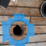 After that, it was time to move on to the stanchion bases and the bow pulpit, where we followed the same basic process of removing the requisite hardware; cleaning up the deck and the stainless steel bases; taping around the area to be sealed; wiping down everything with mineral spirits to ensure good adhesion; then bedding both the bases and screws with LifeSeal.
