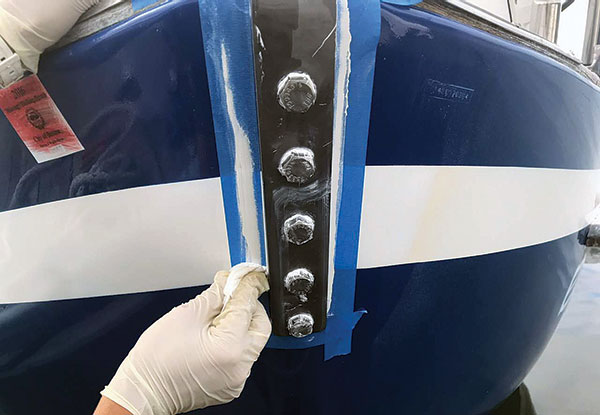 The new titanium chainplates will last the lifetime of the boat (left); The transom was re-glassed and new holes had to be drilled for the chainplate (right).
