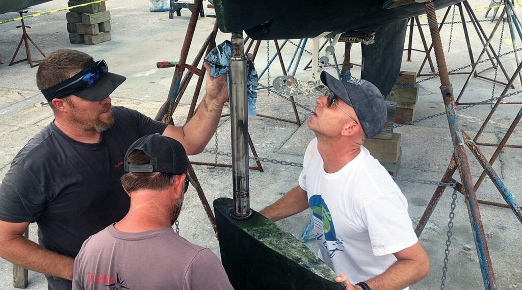 With this idea in mind, Phillip, therefore, had a solid 8in-by-8in stainless steel plate machined to support and reinforce it underneath the cockpit floor. While we talked at length about making it in two pieces that would fit around the rudder post, we wanted as much integrity as possible, so we decided on one solid piece that we would have to drop the rudder to install. It proved to be the right decision since it was during our rudder drop we also uncovered several problems that were turned into powerful redesigns with the help of Brandon and his hardworking team at Perdido Sailor in the Pensacola Shipyard.