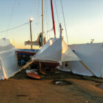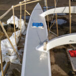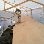 Winter was now also starting to close in for real, motivating us to push that much harder. Soon after hauling Spirit, we’d built tents around each of the amas as we didn’t have time to wait for the right weather. (We needed to be able to work, rain or shine!) We also decided to use fast-curing epoxies and commercial heaters to heat the tents to keep things moving. Luckily we were well prepared for the job at hand and Newport offers some of the finest tradespeople and marine-services people in the world. It was therefore fast and easy to get anything we needed, which helped immensely as we painted the interior and ran new wiring, replaced the batteries and fully serviced both the 20hp Lombardini diesel engine and our Gori folding propeller. Once the decks were made, we vacuum-bagged the edges down for extra strength, after which Peter went inside and laid up the interior deck-to-hull joints.