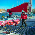 It was now well into December. The breeze was icy cold, and the air was heavy and dense as we bounced Spirit’s mainsail to the top of her 62ft carbon wing mast. She flopped from float to float and felt like she was ready to take off with every puff. Hauling in the main, we bore away and as the jib was unfurled she leapt into high gear. With little aboard apart from our crew, she was much lighter than on our test sail and with her clean bottom she just took off. We threw in a few tacks between Jamestown Island and Newport, then headed north under the Newport Bridge. The breeze was blustery, and Spirit handled well. All systems were working. She was as ready as she’d ever be to begin the journey south.