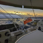 Photo by Jim HooperOne of the most important things for us setting out on a long passage is to establish a sustainable routine, starting as we mean to go on. We sat together over dinner at 6:00 p.m. sharp and marveled at the sky ablaze with fierce reds and pinks as our bows pointed towards the setting sun. By 8:00, it was time for me to go down for my first three-hour sleep. We rotate watch every three hours through the night until 8:00 a.m. During the day the schedule is less rigid. Those first few days are always tough because breaking sleep into short blocks really interrupts the circadian rhythm. After a couple of days not sleeping properly though, the body craves rest and usually begins to do as it’s told.
