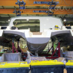 A long row of lidless catamarans, awaiting their innards and deck molds, stretches into the distance as we walk onto the assembly floor. I am surprised to learn that only 50-plus-foot cats are made here in Bordeaux—the new 50, 52, 560 and 620. The smaller boats—the new 40, 42, 450 and evergreen 380—are built in Belleville-sur-Vie, some hours away. For someone who has witnessed the slow death-by-a-thousand-cuts decline of American boatbuilding over the last decade, it is hard to believe that 50ft to 65ft cats could sell by the hundreds. Indeed, so successful has the new flagship, the massive 77ft Seventy 7 been that it is getting its own production facility in order to keep up with demand.