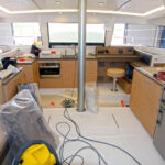 The Nautitech plant is, as I’ve now come to expect, scrupulously clean and well ordered. The production line mirrors that of Bavaria’s monohulls—once the hulls and decks (resin-infused, foam-core construction, of course) leave the mold shop, they progress down the line in a seven-step process where teams install systems and build out the interiors. Workmanship is precise, and protocols are followed strictly.
