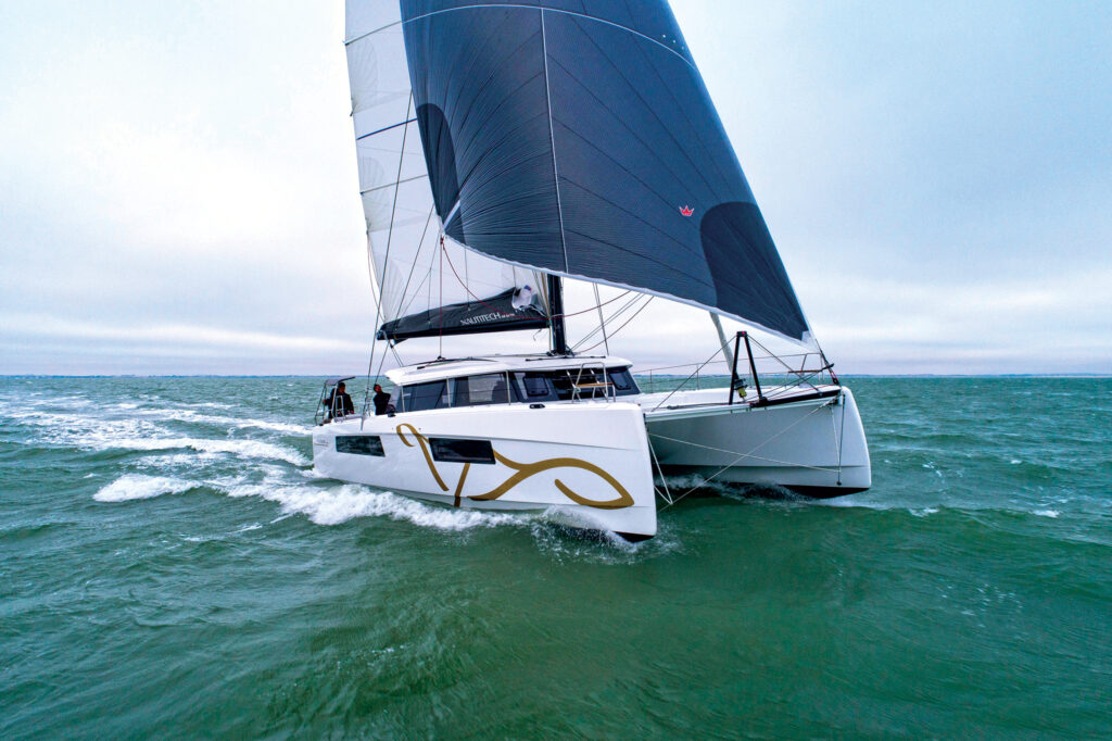 Naval architect Marc Lombard teamed up with designer Christophe Chedal Anglay to create one good-looking boat. The bows are curved and slightly reversed; there are dual chines on the hulls; the windows are angular; and the coachroof is sleek and angled upward in the aft sections, an effect that adds the perception of movement even at rest. It all comes together well. Our test boat even had the optional black paint on the aluminum mast that made it look like carbon.