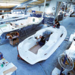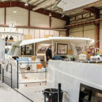 This past summer Nautitech moved from running a pair of dedicated production lines (building the 40 Open and the 46 Open/Fly & 47 Power) to one single multi-model line with an eye toward creating a more agile “pull” flow process and increasing worker versatility.
