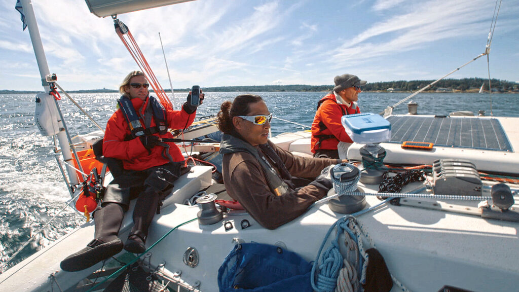 But no R2AK is complete without a Murphy moment. Theirs came in Hecate Strait, when the rudder kicked up with Alula in full surf mode. Kane was fighting the tiller while Eastham was wrestling down the screecher. Tapec, on off-watch, got thrown about in his bunk when the boat rounded up: “There was yelling on deck and Spike came tumbling toward the cabin. I held on and reached for my survival knife, so I had it at hand for myself or someone who might need it.” It took some doing, but together Eastham and Kane got the rudder issue worked out. Whew. “You adapt,” Kane shrugged it off afterward. “If you have able-bodied crew, you can push harder than normal. I’d never set the screecher with only three adaptive sailors on board.”