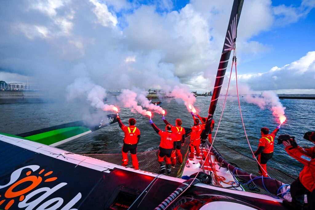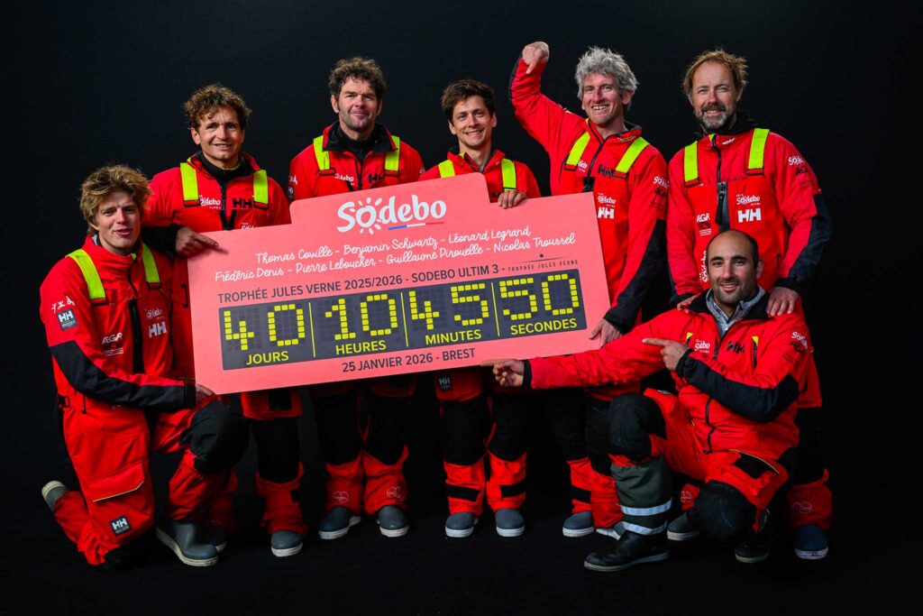 The first was Sodebo Ultim 3, which arrived on Sunday after 40 days, 10 hours, and 45 minutes at sea, setting a new world record and winning the Jules Verne Trophy for history’s fastest global circumnavigation under sail. Skipper Thomas Coville and his team (Benjamin Schwartz, Frédéric Denis, Pierre Leboucher, Léonard Legrand, Guillaume Pirouelle, and Nicolas Troussel) bested the previous record by 12 hours.