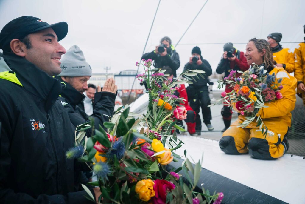 When they arrived in Brest, Team Sodebo was there to greet them with flowers.