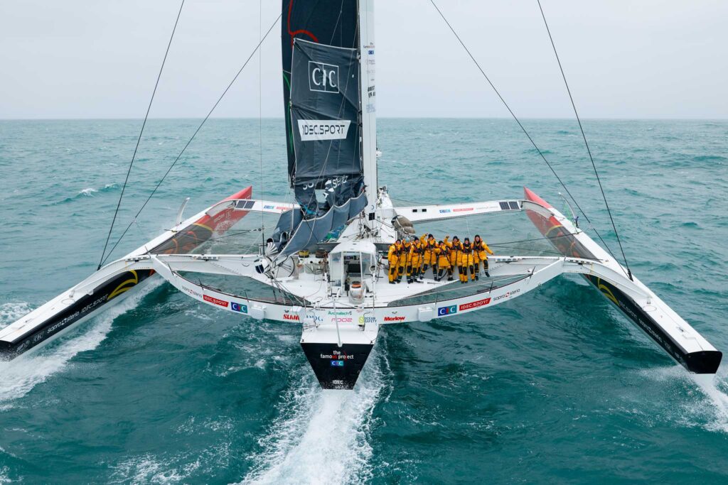 The very next day IDEC Sport, now sailed by The Famous Project CIC, crossed the same finish line after 57 days, 21 hours, and 20 minutes at sea. Led by Alexia Barrier and her co-skipper Dee Caffari, the team became the fastest all-female team to sail non-stop around the world.