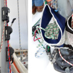 The mast was set up with clutches on either side to handle the twin spinnaker halyards and poles (left); Simple rope bags took care of the halyards and other line tails (right)